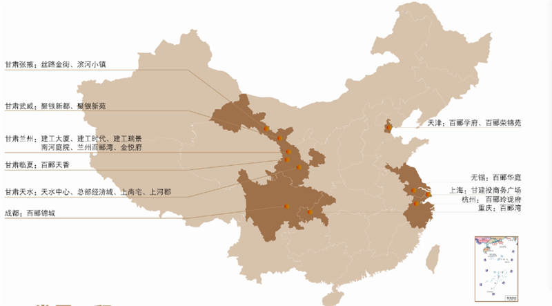 在“十三五”期間,置業(yè)公司立足長遠,在蘭州、張掖、天水、武威、臨夏等絲路黃金段城市大力開發(fā)房地產(chǎn),同時以全新的思路、全新的視角積極開拓市場,聚焦國家重點規(guī)劃建設(shè)的京津冀、長江經(jīng)濟帶、成渝等區(qū)域省會城市+一二線城市,構(gòu)建了均衡穩(wěn)健的全國性戰(zhàn)略布局,“大地產(chǎn)模式”版圖逐步成型。公司堅定推進“走出去”戰(zhàn)略,自2015年至2020年間,置業(yè)公司相繼在上海、天津、成都、重慶、杭州、無錫等地開發(fā),截至目前公司正在開發(fā)土地441.99畝,儲備土地1438.38畝,其中省內(nèi)儲備1280.71畝,省外儲備157畝,這些土地資源的儲備為公司持續(xù)發(fā)展奠定了堅實基礎(chǔ)。
