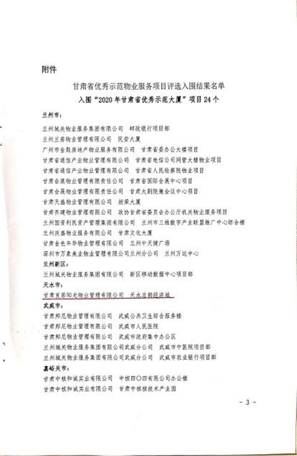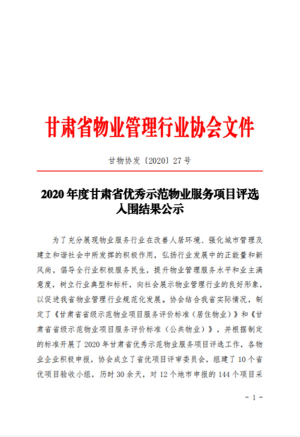 近日,天水上尚宅項(xiàng)目獲2020年度“甘肅省物業(yè)管理優(yōu)秀示范項(xiàng)目”,總部經(jīng)濟(jì)城獲2020年度“甘肅省物業(yè)管理優(yōu)秀示范大廈”。本次評選活動由12個(gè)地市申報(bào)的144個(gè)項(xiàng)目參與,評審委員會采取聽、看、談、訪、查等多種方式,對標(biāo)對表對參選項(xiàng)目進(jìn)行評選,歷時(shí)30余天,最終確定評選結(jié)果。