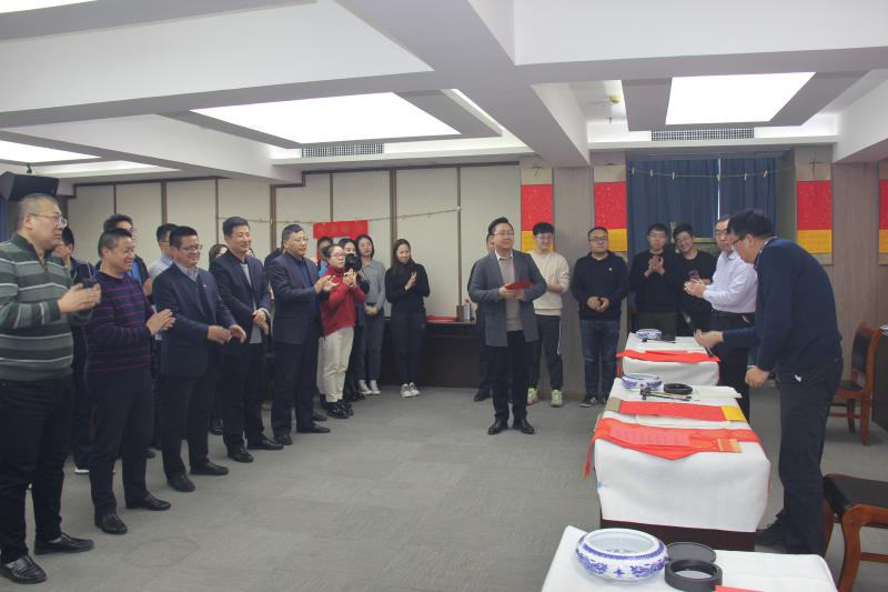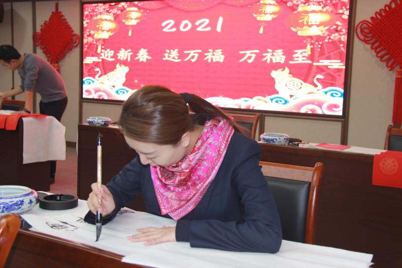 公司書畫愛好者揮毫潑墨,現(xiàn)場寫春聯(lián)送福字,用吉祥如意的春聯(lián),紅紅火火的大“?!弊郑瑸槁毠に蜕闲麓旱淖8?。