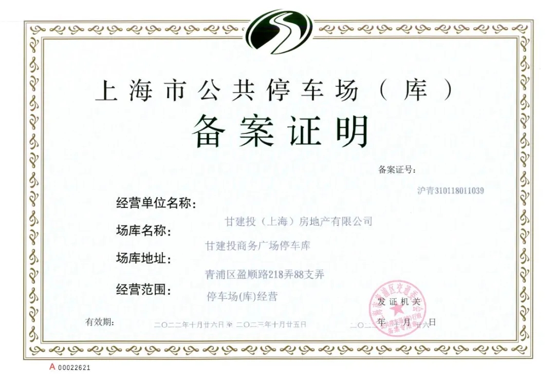 近期,上海子公司正式取得《上海市公共停車場(庫)備案證明》,甘建投商務(wù)廣場停車場(庫)可正常對外收費經(jīng)營。