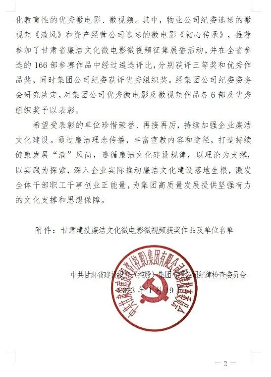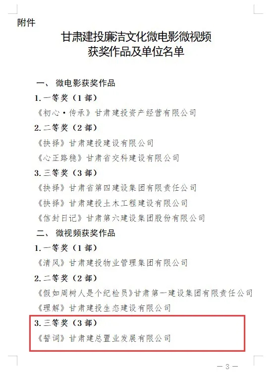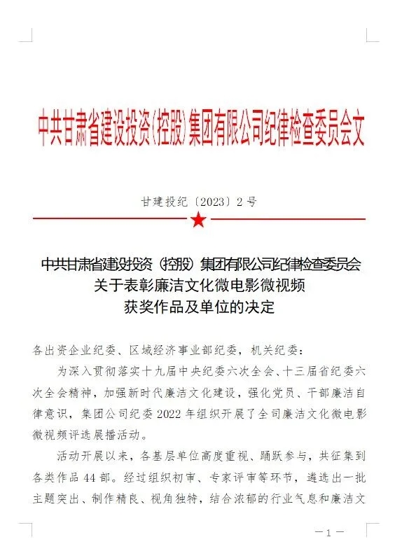 1月19日,在集團(tuán)公司紀(jì)委2022年開展的全司廉潔文化微電影微視頻評(píng)選展播活動(dòng)中,公司紀(jì)委榮獲“甘肅建投廉潔文化微電影微視頻三等獎(jiǎng)”榮譽(yù)稱號(hào)。