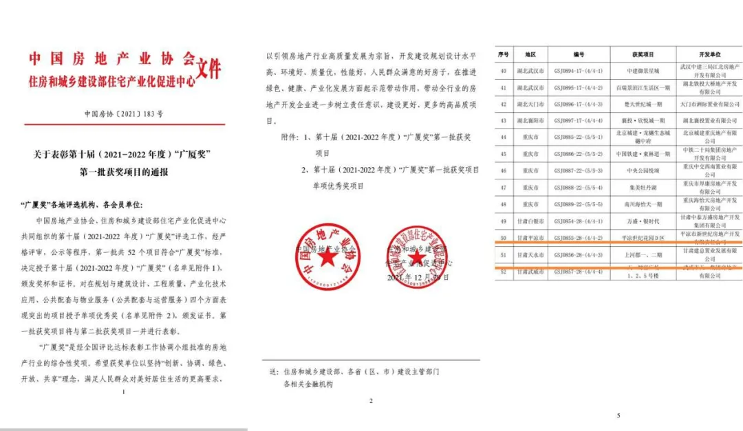 近日,由甘肅建投置業(yè)公司開發(fā)建設(shè)的天水上河郡一、二期住宅項目,榮獲第十屆(2021-2022年度)第一批中國房地產(chǎn)“廣廈獎”。該項目成為置業(yè)公司在天水開發(fā)建設(shè)的項目中第二個獲得該殊榮的項目。也是2022最驚喜的新年禮物。